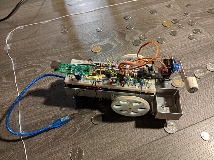 Our team developed this robot for a competition to see whose robot could collect the scattered coins fastest.