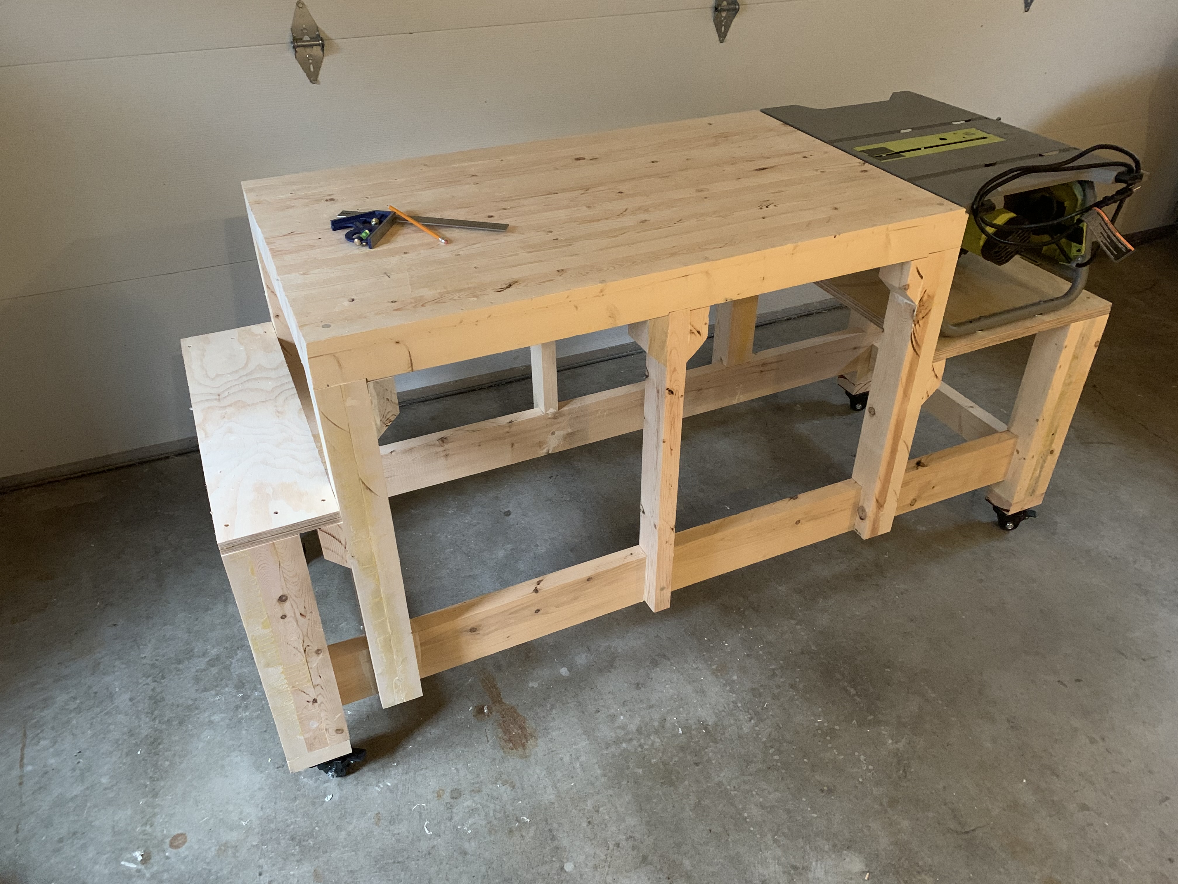 To facilitate my woodworking hobby, I designed and built this workbench taking inspiration from the English Nicholson style of workbench. It also includes a section for a jobsite table saw which allows the tabletop to be used as an outfeed.